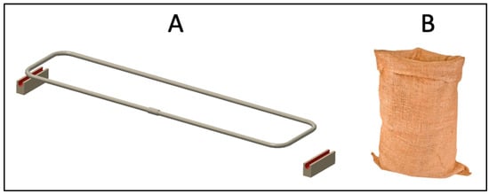 The storage parts and a collector bag. (A) Aluminum support and a rectangle loop made of aluminum pipe; (B) a wet gunny collector bag.
