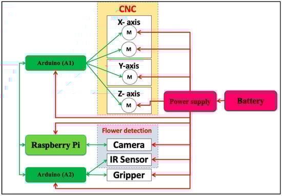 The Raspberry Pi communicates with the Arduino using the serial protocol that was used to operate the entire system, in the beginning sending the actuation signal to the camera for image acquisition and starting work on the YOLOv5 deep learning program for flower detection and placement, then sending a reference to Arduino UNO (A1) to carry out the required task as shown in (Figure 8). The JFAPS has four stepper motors (model no. ISC176, having a torque value of 2.5 N/mm2), two for the X-axis and a single motor for the Y, and another for the Z-axis. The four microstep drivers move based on the position of the detected flower. To position the system at a specific coordinate or to turn on and/or off the gripper, commands must be communicated to the Arduino UNO (A2).