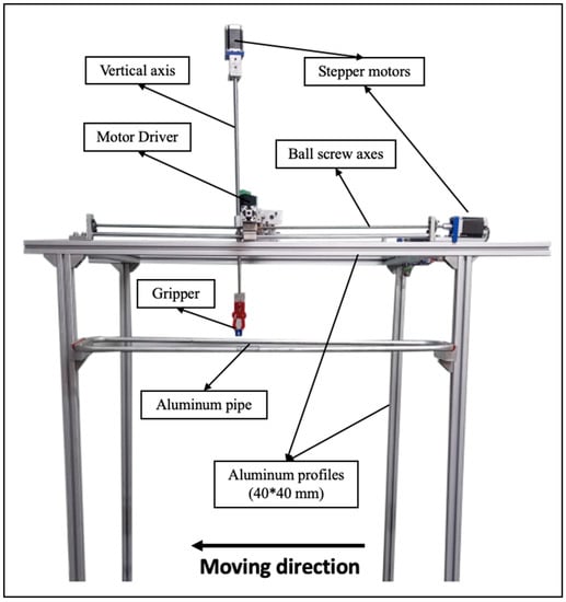 The mechanical parts of JFAPS design are based on a computer numerical control machine (CNC). These parts are constructed with aluminum profiles (40 × 40 mm). The whole frame was made primarily from aluminum profiles and linear rail (ball screw axes) that permit linear motion. The final dimensions of the system frame were 970 × 970 × 1500 mm for length, width, and height, respectively, with the vertical arm having a length of 700 mm. Four wheels (35 × 40 mm) made of rubber were attached to the system frame for easy movement between rows in the farm. As illustrated in Figure 4, the ball screw axes (moving rail) are made up of a linear module with a ball screw that allows for the back-and-forth movement of a carriage and a rotatory servo motor that powers the motion. JFAPS consists of 3 axes; the Y-axis cross rail is enabled by the X-axis rails connecting the end point with the screw-bearing subassembly to the Z-axis, while the vertical axis is mounted on the screw-bearing subassembly on the Y-axis with the help of specially designed “C” bracket.