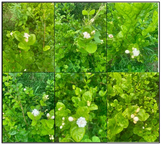 - Karimane, N. Sreekantarao, Morphological Diversity of Jasmine Cultivars and Wild Species in Karnataka. Mysore J. Agric. Sci. 2017, 51, 822–831. [Google Scholar]