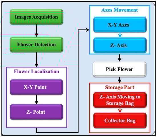 Furthermore, several automated harvesting techniques for saffron flowers have been used. Designs were based on estimations about the saffron plants’ location, size, and sensitivity requirements as well as other factors including the humidity of the surrounding air. Asimopoulos et al. [10] designed an autonomous vehicle that consists of the vehicle, structure, sensors, and motors. The gripper moves mechanically and automatically along the axis while the sensors are mounted to the axis shell (robotic arm). The gripper closes and advances 10 mm upward, cutting the blossom in a motion like that of a human hand, while the color sensor, which is located immediately above the gripper (and the flower), assesses whether the flower is ready for harvesting. However, other concepts are used for image analysis to compute the best cutting spot, which is then given to a driver who positions a straightforward mechanical cutting mechanism to produce a clean cut. The flower is pressed against the feed or front beater, which has a slot for the saw’s cutting teeth, by a cutting disc that rotates continuously to make the cut [11]. Additionally, Denarda et al. [12] created a two-finger gripper in conjunction with a particular transmission system made up of a leaf spring and a camera that enables a delicate separation of the saffron flower from the stem for autonomous harvesting. Airflow was used to gather the harvested saffron blossoms in a storage tank.