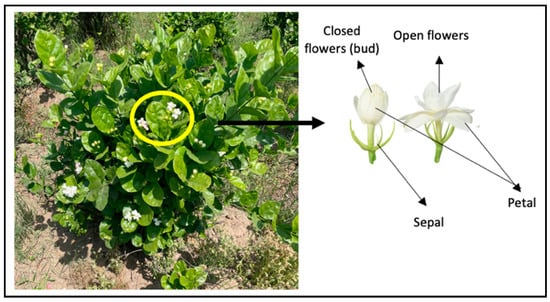 Jasmine shrubs were located in rows with a maximum spacing of 1.30 m, and the distance between shrubs was 1.00 m. In addition, it was observed that the flowers were located in clusters of three to twelve. The flowers were divided into fully formed flowers and unopened flowers (Figure 14). Table 1 and Table 2 illustrate the most important geometric properties of jasmine shrubs and flowers that were used in designing the JFAPS. The maximum height of the jasmine shrubs while bearing the flowers was about 1.5 m, with a surface area of 0.0000785 m2. One shrub bore white flowers, which were about 20 mm in diameter. The average diameter of the unopened flower buds (one day before opening) was 8 mm, with an area of 200 mm2, and the detachment force between the petal and sepal was 1.5 N. In addition, the compressive strength was 4.92 N. However, the average diameter of the fully opened fresh flowers was 20 mm, the surface area of the opening flowers was 1245 mm2, and the detachment force between petal and sepal was 0.7 N.