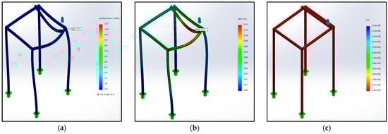 (a) Stress distribution among mechanism links with deformation scale 1610. (b) Deflection distribution among mechanism links with deformation scale 1610. (c) Factor of safety distribution among mechanism links.