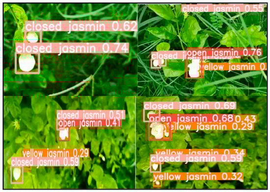 As shown in Figure 19, the proposed YOLOv5 model was used to identify and categorize various targets. Each bounding box was marked with the category to which it belongs and given a confidence score to indicate the likelihood that the detected object belongs to a particular class or that the target’s center was found in the grid. Due to the vast quantity of training examples, the open jasmine class’s average predictions have greater accuracy levels and distinctive color characteristics. However, the closed and yellow jasmine classes have less accurate predictions. This is caused by the closed flowers’ modest size, location among the leaves, and likeness to yellow blossoms. As a result, the open jasmine, closed jasmine, and yellow jasmine provided average predictions that were roughly 0.80, 0.65, and 0.55, respectively.