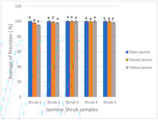 The average of precision using YOLOv5. Data are mean ± SD (n = 3). Columns that are headed with different letters are significantly different (p < 0.05) within the same kind of jasmine flowers according to the Duncan test.