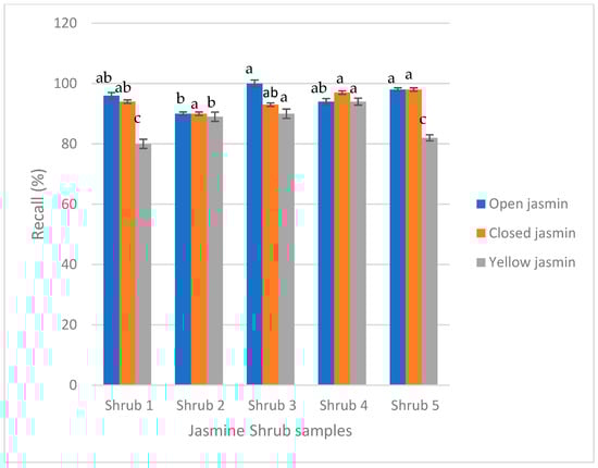 The average of recall using YOLOv5. Data are mean ± SD (n = 3). Columns that are headed with different letters are significantly different (p < 0.05) within the same kind of jasmine flowers according to the Duncan test.