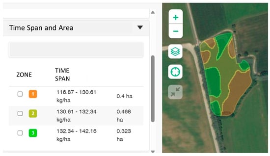 So, the simulator has been developed to replicate the management of the contents of prescription maps to simulate, for example, a precision distribution (seed, fertilizer, and crop protection products). Figure 2 shows an example of a prescription map in which 3 different field zones are combined with three different doses of fertilizer.