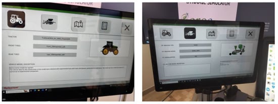 Once the characteristics of the machines have been defined, the software application allows the choice between tractors with manual transmission, power shift or continuously variable (simulated by an automatic with 99 gears); two- or four-wheel drive tractor; rural or city environment; night or day working conditions; auto-guidance or manual; agricultural task; and level of technology of the implement (Figure 11).