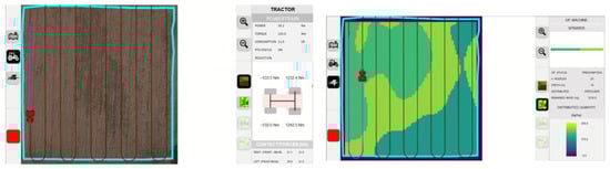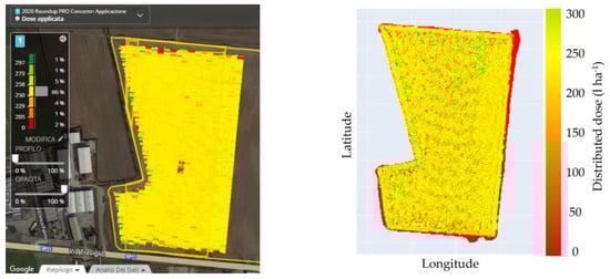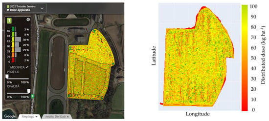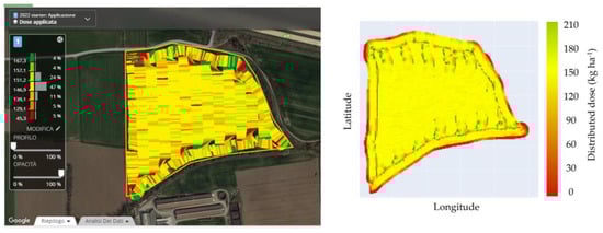 The three operations carried out were successfully reproduced on the simulator. The results are reported graphically for immediate reading as distribution maps in Figure 16, Figure 17 and Figure 18. On the left are the maps generated by the MyJohnDeere© system, and on the right are the simulation results.