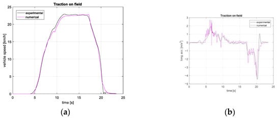 Figure 14 collects the results regarding speed, longitudinal acceleration, and front and rear longitudinal loads for traction on field maneuver from standstill to 22 km h−1 in AWD traction mode. This maneuver simulates the tractor working on the field. Numerical curves lay on experimental curves. Low-frequency oscillations are not present in experimental profiles due to signal filtering.