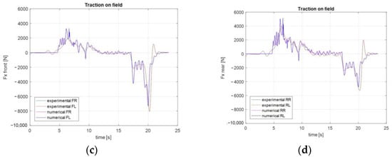 Traction on field maneuver numerical vs. experimental results: (a) velocity profile, (b) longitudinal acceleration profile, (c) front axle longitudinal loads, (d) rear axle longitudinal loads.