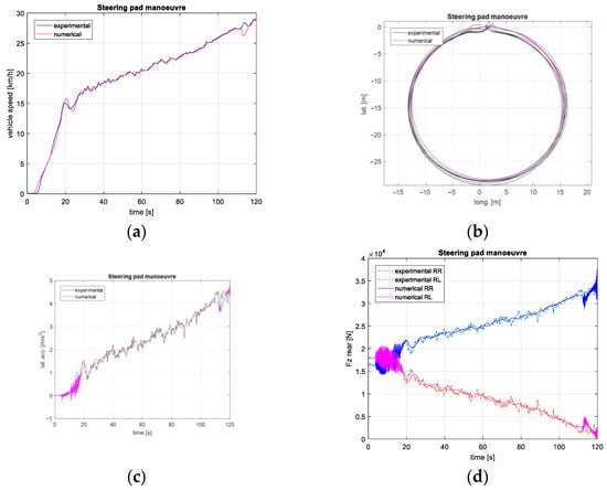 Steering pad maneuver numerical vs. experimental results: (a) velocity profile, (b) imposed trajectory, (c) lateral acceleration profile, (d) rear vertical loads.