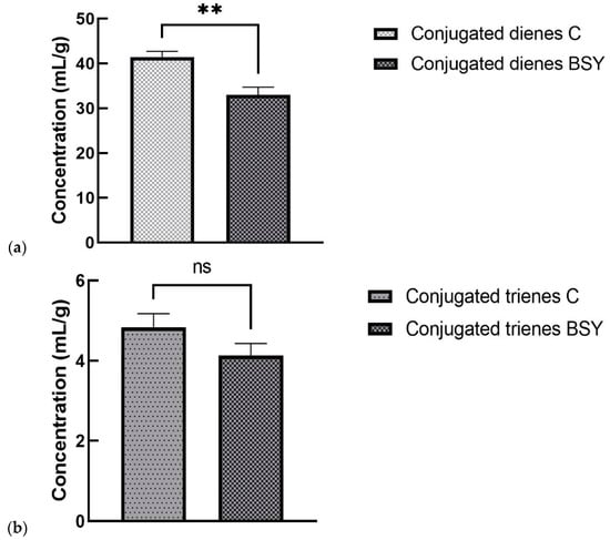 The concentration of conjugated dienes (a) and conjugated trienes (b) in the control (C) and brewer’s spent yeast (BSY) groups. The results are presented as means ± SEM; ** represents significant differences between means (p < 0.05), and “ns” represents no significant differences between means.