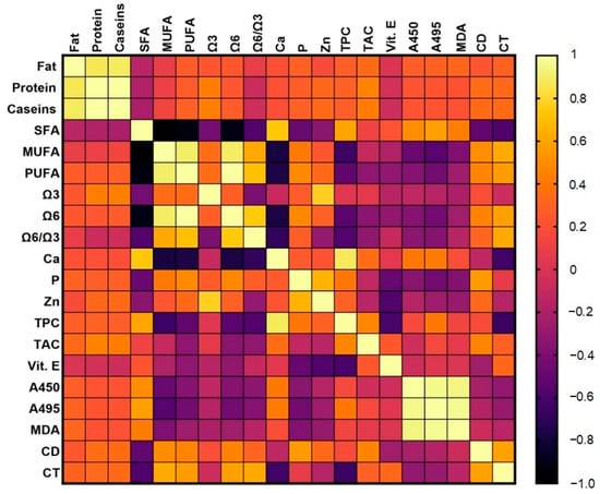 Heatmap presenting the Pearson’s correlations between the primary chemical composition of milk, fatty acid profile of milk, milk minerals, antioxidant compounds, and milk lipids’ oxidation products. Abbreviations: SFA, saturated fatty acids; MUFA, monounsaturated fatty acids; PUFA, polyunsaturated fatty acids, Ω3, omega 3 fatty acids; Ω6, omega 6 fatty acids; Vit. E, vitamin E content; TPC, total polyphenols content; TAC, total antioxidant capacity; A450 and A495, specific absorbances for saturated aldehydes and dienals, respectively; MDA, malondialdehyde concentration; CD, conjugated dienes; CT, conjugated trienes.