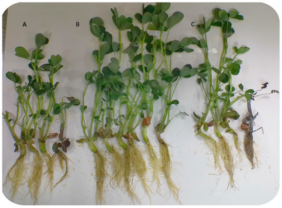 Image of Fusarium oxysporum infection in peanut plants; (A) F. oxysporum-infected peanut plants, (B) F. oxysporum-infected peanut plants after TG5 bacterial fertilizer treatment, and (C) F. oxysporum-infected peanut plants after carbendazim treatment.