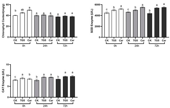 Chlorophyll is the main pigment that characterizes the photosynthetic capacity of plants. Compared with the control, a change in chlorophyll content in peanut leaves was observed after TG5 treatment (Figure 2). The chlorophyll content in peanut leaves after TG5 treatment was superior to the control, although the change in the number of individual leaves was not very significant. Given the number of leaves, there was a significant difference in chlorophyll content between the entire plant and the entire plot, resulting in the significant accumulation of substances caused by photosynthesis. The accumulation of ROS caused membrane lipid peroxidation and the loss of membrane differential permeability in plants, leading to defense reactions such as allergic necrosis and phytoalexin production. SOD and CAT eliminated ROS and superoxide anion in plants, thus providing plant disease resistance. Compared with the control, after 72 h of TG5 treatment, the contents of SOD and CAT in peanut plants increased by 23.2 and 14.0%, respectively, significantly increasing the stress resistance of the peanut plants (p < 0.05). Compared with Car treatment, the effect of TG5 on SOD and peroxidase in peanut plants was similar and less harmful to the environment.