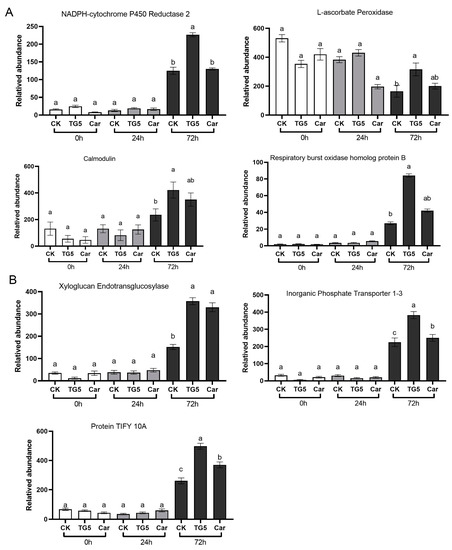 Our data show that, after 72 h, TG5 treatment increased the expression levels of NADPH cytochrome P450 reductase 2, L-ascorbate peroxidase, calmodulin, and NADPH oxidase genes by 184, 205, 180, and 303% (p < 0.05), respectively, compared with the control values (Figure 5A). The expression levels of calmodulin and NADPH oxidase genes increased by 147 and 154%, respectively, after treatment with Car treatment (p < 0.05).
