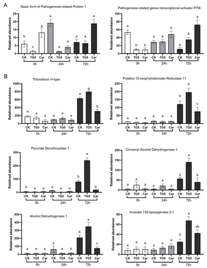 Pathogenesis-related proteins are produced when plants respond to stress, pathogen attacks, or abiotic stimulation, and play an important role in plant defense systems [3]. Our data show that, after 72 h, TG5 treatment decreased the expression of pathogenesis- related protein 1 gene by 12.0% (p < 0.05) and increased the expression of PTI6 pathogenesis-related gene by 316% (p < 0.05) compared with the control. Meanwhile, Car treatment increased the gene expression levels of pathogenesis-related protein 1 and pathogenesis-related gene transcriptional activator PTI6 by 268 and 668%, respectively (p < 0.05; Figure 6A).