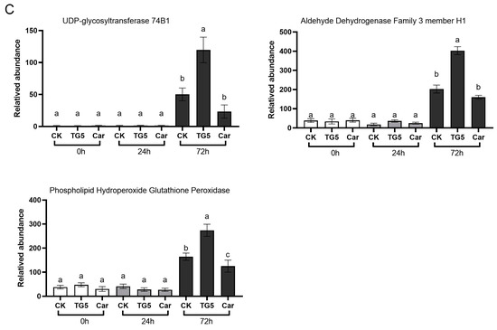 Compared with the control, our data show that after 72 h, TG5 treatment increased the gene expression levels of thioredoxin H-type, 12-oxygenated plant diene reductase 11, pyruvate decarboxylase 1, pyruvate decarboxylase 2, cinnamyl alcohol dehydrogenase 10, and alcohol dehydrogenase 1 by 125, 158, 256, 243, 302, and 165%, respectively (p < 0.05), whereas Car treatment reduced the expression levels of these genes by 50.9, 40, 84, 75, 29, and 62%, respectively (p < 0.05; Figure 6B). Furthermore, compared with the control, TG5 treatment increased the expression levels of UDP glycosyltransferase 74B1, aldehyde dehydrogenase family member H1, and phospholipid hydrogen peroxide glutathione peroxidase genes by 236, 196, and 166%, respectively (p < 0.05), whereas carbendazim treatment reduced the expression levels of these genes by 59, 25, and 22%, respectively (p < 0.05; Figure 6C).