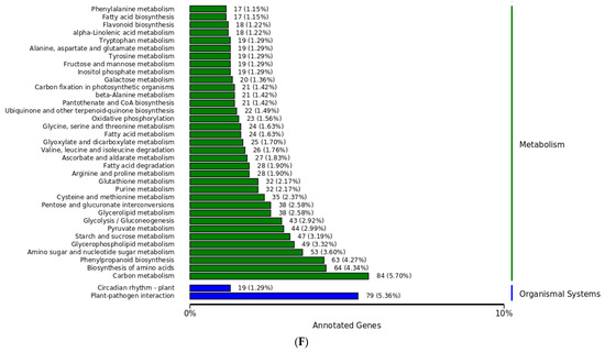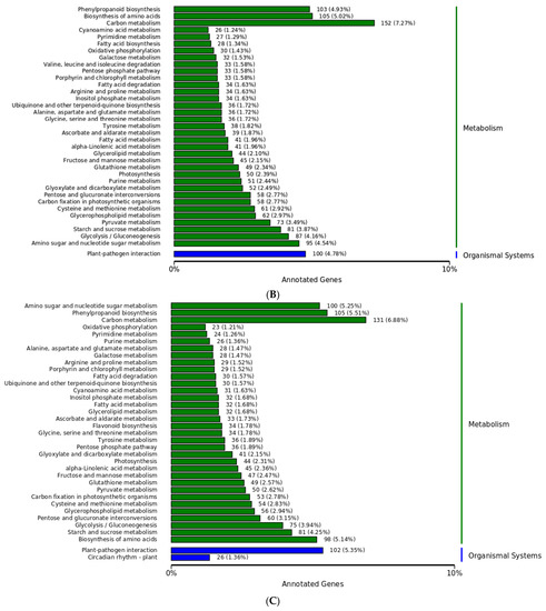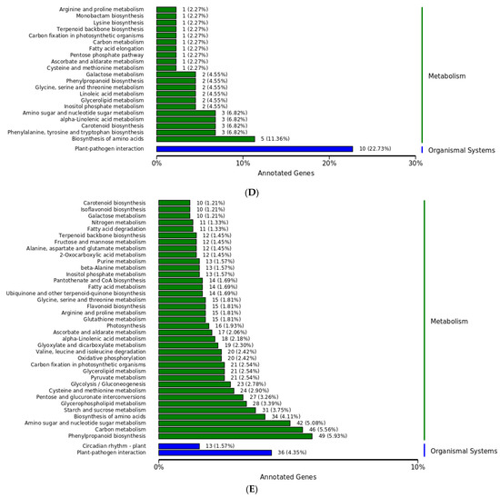 Our data show the gene pathways of influence during host–pathogen interactions (Figure 7). A pathway check was performed to examine DEGs during host–pathogen interactions. These pathways represent three types of metabolic paths, MF, CC, and BP, as well as other metabolic pathways, including linoleic acid 13S LOX, NADPH cytochrome P450 reductase 2, and 12-oxo plant dienoic acid reductase 11. In this case, the metabolic pathway was Arabidopsis K000591 (linoleic acid metabolism). The metabolic pathway of abscisic acid receptor PYL4 and NADPH oxidase was Arabidopsis K004016 (MAPK signaling pathway plant), and for xylanase endoglucanase/hydrolase protein 22 and protein TIFY10A, it was the Arabidopsis K004075 (plant hormone signal transduction) pathway. The pathway for disease progression-related protein 1, disease-related gene transcriptional activator PTI6, and calmodulin metabolism was Arabidopsis K004626 (plant–pathogen interaction). The metabolic pathway of L-ascorbate peroxidase and abscisic acid 8’-hydroxylase was Arabidopsis K000906 (carotenoid biosynthesis); for phospholipid hydrogen peroxide and glutathione peroxidase, it was Arabidopsis K000480 (glutathione metabolism); and for UDP glycosyltransferase 74B1, it was Arabidopsis K000966 (glucoside biosynthesis). The H1 metabolic channel of alcohol dehydrogenase 1 and aldehyde dehydrogenase family 3 was Arabidopsis K000620 (pyruvate metabolism).
