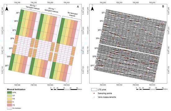 The study area located in Bad Lauchstädt. (A) Management factors of the long-term experiment. (B) Long-term experimental site with sampling points and Veris transects. Coordinate reference system: EPSG 25833.