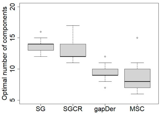 Boxplots of the optimal number of PLSR components of the 25 models trained with data preprocessed by SG: Savitzky–Golay, SGCR: Savitzky–Golay + continuum removal, gapDer: Gap-Segment derivative, and MSC: multiplicative scatter correction.