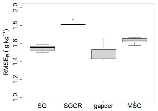 Figure 5 presents the predictive model performance of the PLSR models. The best models were the ones using SG and gapDer with a median RMSER value below 1.6 g kg−1. They also indicate a lower dispersion compared to the other two models as is observable in the comparison of predicted versus measured values (Figure 6). SG is a common method that mainly smoothes the original signal to remove multiplicative and additive effects [41]. Meanwhile, the gapDer method works by derivate specific segments of the signal [42]. The gapDer is the preprocessing method with a lower number of wavelengths used compared with the others selected in this study, thus the reduction in the model complexity [43] could have a positive effect in this case. The differences observed between preprocessing methods remark on the importance of selecting an adequate method. There is no standard procedure even under laboratory conditions since the required type and amount of preprocessing is data specific for soil [3,44].