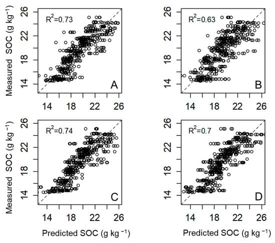 Predicted versus observed values of modeling Step 1, with five predictions per sampling location. (A) SG: Savitzky–Golay, (B) SGCR: Savitzky–Golay + continuum removal, (C) gapDer: Gap-Segment derivative, (D) MSC: multiplicative scatter correction.