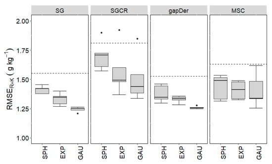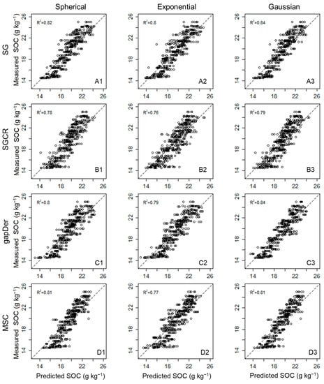 The overall predictive model performance of modeling Step 1 + Step 2 (R+K model) is presented in Figure 7 and the scatter plot with a line of equality is shown in Figure 8. By including modeling Step 2, the overall predictive performance was further improved. The best predictive performance for Step 2 was achieved with the Gaussian model. Accordingly, the best results were obtained with the combination SG—Gaussian ( = 1.24 g kg−1, = 0.84) and gapDer—Gaussian ( = 1.26 g k−1, = 0.82). The observable pattern of the dispersion in the predictions (Figure 8) has more similarities concerning the preprocessing method than with regard to the semivariogram model.
