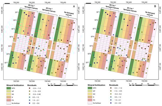 Average residuals of predicted SOC values per sampling point location of (A) Savitzky–Golay—Gaussian, and (B) Gap-Segment derivative—Gaussian methods.