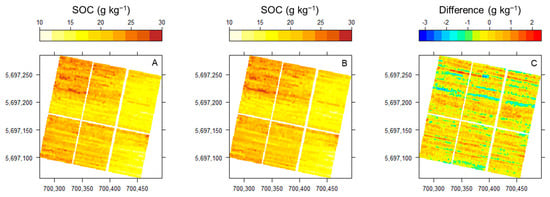 The median of predicted SOC values of the R+K models with the best performance. (A) Savitzky–Golay—Gaussian, (B) Gap-Segment derivative—Gaussian, (C) difference between models.