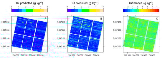 Interquartile range (IQ) of predicted SOC values of models with the best performance and the difference between predictions. (A) Savitzky–Golay—Gaussian, (B) Gap-Segment derivative—Gaussian, (C) difference between models.