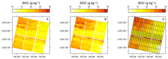Regarding the generated maps, different methodological data processing and modeling combinations resulted in similar SOC spatial distribution, which could be expected due to the high sampling density of the Veris measurements reducing the uncertainty of the spatial interpolation. A striping effect in the SOC distribution maps was evident, which was likely caused due to the Veris transect measurements in one direction [12] and due to the short maximum spatial separation distance considered for the experimental semivariograms. This effect could be changed with data aggregation using different approaches. To illustrate alternatives for mapping the field, Figure 12 presents maps using a Savitzky–Golay—Gaussian model with pair of point aggregation (Figure 12A), another with extending the maximum spatial separation distance of the experimental semivariogram to 25 m (Figure 12B), and using block kriging with blocks defined by the plot treatments (Figure 12C). By pair of point aggregation, the striping effect is diminished but still visible. When extending the maximum spatial separation distance, the striping effect disappears, and a more general SOC distribution is observed. Nevertheless, a generalization of the SOC distribution could mask the values of small plots and the spatial variation inside the plots; therefore, it is better applied in fields with homogeneous management. In the case of block kriging, a map with blocks divided by the plot treatments is presented. Block kriging has been less used in soil mapping compared with point kriging methods [48]. Generally, it uses blocks of the same size to upscale point observations [49]. In the LTE, the block kriging approach could be an alternative to monitor SOC changes by having a unique value per plot treatment, although it will not represent the internal variation inside the plot.