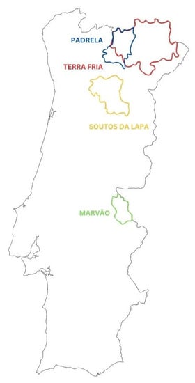 Portugal occupies the seventh position worldwide in chestnut production, with a production of 37,876 tons, as result of the expansion of chestnut grove planting areas [8]. Portuguese chestnuts have an enhanced quality recognized nationally and internationally. To protect the specificity of this product, and due to its economic and social importance, protected designations of origin (PDO) (EU Regulation no. 1151/2012, article 5) for Portuguese chestnuts were created. This agrarian policy of the European Union outlines territorial quality products as components of local development, whose primary objective is the improvement and preservation of the genetic heritage of the product, setting guidelines, parameters and rules to distinguish the production and market in the various regions [13,14]. Four PDO for chestnut were established: two of them in Trás-os-Montes (“Castanha da Padrela” and “Castanha da Terra Fria”), one in the region of Portalegre (“Castanha de Marvão-Portalegre”) and another in Beira Alta (“Castanha dos Soutos da Lapa”) [10]. A schematic representation of the 4 PDOs in Portugal is depicted in Figure 1, highlighting the municipalities included. Each PDO for chestnut production has its own history, predominant varieties and production area. The most popular and representative varieties in Portugal are “Boa ventura”, “Judia”, “Longal” and “Martaínha”, but many more were identified and cultivated, namely “Amarelal”, “Aveleira”, “Bebim”, “Benfeita”, “Côta”, “Lada”, “Lamela”, “Negral” and “Trigueira”, among others [7,15].