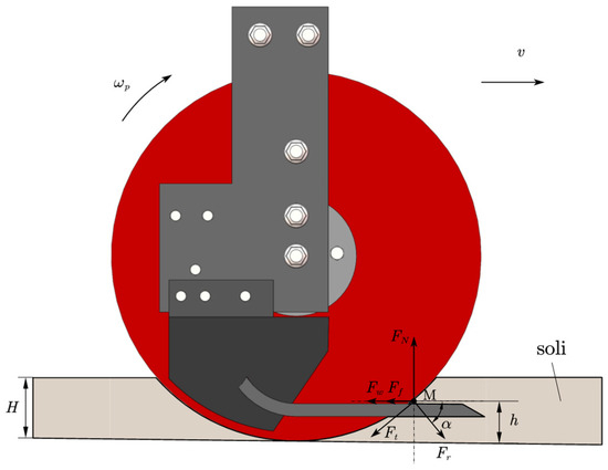 The ordinary single-disc coulter balances the disc’s cutting force by using the soil’s supporting force and the straw’s bending resistance. Due to the straw’s low stiffness, when the soil is soft, the straw’s supporting force fluctuates with its depth, making it difficult to reach the force balance, difficult to cut off [11], and simple to press into the soil by the disc. The seeds are easily aerated by straw when sowing at this time. Increase the support shovel at the bottom so that when the straw penetrates the soil and reaches it, the support force is fixed and may be conducive to straw cutting. If the soil is loose, the disc drives the straw into the soil until it touches the support shovel at a distance of h from the furrow’s bottom. Assume that the angle between the support shovel and the soil level is 0°. Use the straw as a mass point M to analyze the instantaneous cutting process. The force of the straw is shown in Figure 3. The support shovel provides an upward supporting force as the disc presses the straw against it, and the only force between the soil and the straw is the horizontal resistance Fw.