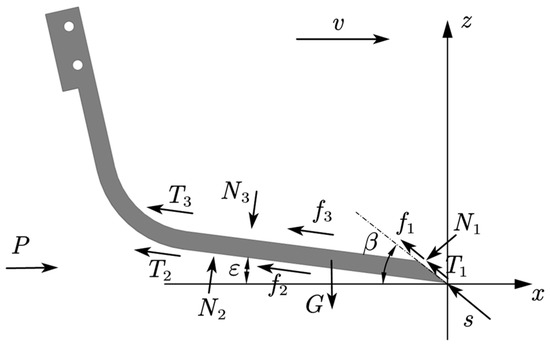 The support shovel’s tip first enters the soil, and as it advances, the soil will produce tillage resistance as the tip cuts through it. As the operating speed changes, the soil’s shear strength will also change because the tip of the support shovel will cause the soil to be squeezed and deformed until it is crushed, which results in a dynamic change in the resistance. The support shovel moves through the soil at a uniform speed, assuming that the soil is homogeneous and isotropic. At this point, the tillage resistance is mostly seen in the soil’s cohesion and pressure, as well as its friction with and adhesion to the support shovel [22]. Figure 4 depicts the force analysis of the supporting shovel in this condition.