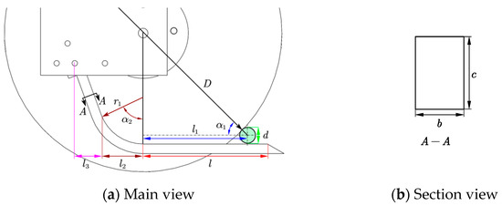 Figure 5 illustrates the structure of the support shovel. Decide on the main body’s dimensions, which shall be 14 mm for the width b and 16 mm for the thickness c, to ensure that the support shovel has adequate strength. When cutting a straw with a disc and a support shovel, the length l should guarantee that the straw can be supported properly. At this time, l > l1 + d/2, where the diameter of maize straw d is gradually increasing from the top down, measures the diameter of the straw’s bottom, which ranges from 21 to 30 mm. Take the bottom of the diameter of the straw at the time of the largest value of 30 mm. The length of l1 can be calculated by Formula (6), combined with Figure 5a substituting the relevant data that can be obtained l1 = 181.1 mm; at this time, l > 196.1 mm. To prevent the straw from sliding out along the shovel tip, a margin of at least 10mm should be set. The design margin should be smaller than 50 mm since l is too lengthy to support the shovel’s strength, and the length of l after rounding is between 206 and 246 mm. According to the support shovel arc section arc angle α2 and the support shovel arc section arc radius r1, the support shovel arc section in horizontal plane projection length l2 can be calculated. Set the support shovel arc section arc angle α2 for 70° and the support shovel arc section arc radius r1 for 74 mm.