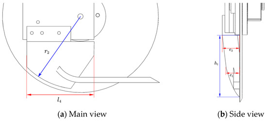 The disc cuts out slits in the soil, but because they are not wide enough for seeds to fall through, it is required to install auxiliary devices to make them wider. On the disc’s one side, soil can be compressed by the scraper to create the seed furrow. The scraper adopts an inclined structure with a narrow bottom and wide top, as shown in Figure 6. The lower part of the narrower is for the soil back to the gap reserved for the convenience of wet soil back to the seed furrow, so the lower periphery of the scraper is designed as a circular arc, the arc center and disc center coincide, in order to avoid the bottom of the furrow is too wide, the periphery of the scraper radius of the arc should be less than the radius of the disc, take r2 = 220 mm. Winter wheat is typically planted 3 to 5 cm deep in the Huang-Huai-Hai region, with a furrow width of 40 mm, a disc thickness of 6 mm, a lower scraper e1 scraper width of 34 mm, and an upper scraper e2 scraper width of 40 mm. The scraper’s length is too short, putting too much pressure on one side of the soil while also making it difficult to direct seeds. Its length is also too lengthy, which degrades the quality of the seed furrow that leads back to the soil and is recognized as l4 = 199 mm.