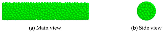 The simulation test involves the disc cutting and crushing of straw. The maize straw is equivalent to an isotropic material, and the Hertz–Mindlin with bonding contact model in EDEM software is utilized to better represent the crushing state of straw. The parameters of maize straw in the literature [31,32] were used to set up the straw model. These parameters include the Poisson’s ratio of straw, which is 0.40; its density, which is 470 kg·m−3; its shear modulus, which is 1.7 × 106 pa; its contact model, which is the Hertz–Mindlin with bonding model, which sets the radius of the particles at 2 mm and the radius of the bonded disc at 3 mm; its normal stiffness per unit area, which is 9.6 × 106 N·m−3; its shear stiffness per unit area, which is 6.8 × 106 N·m−3; its critical normal stress, which is 8.72 × 106 Pa; and its critical shear stress, which is 7.5 × 106 Pa. The diameter of straw is taken to be 25 mm, the length is taken to be 180 mm, and the coefficient of restitution of the straw–straw contact is 0.49, the coefficient of static friction is 0.14, and the coefficient of rolling friction is 0.08; the coefficient of restitution of the contact between straw and 65 Mn steel is 0.66, the coefficient of static friction is 0.23, and the coefficient of rolling friction is 0.12, and the straw model is shown in Figure 7.