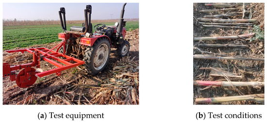 On 15–18 November 2022, the test was conducted in Xinglongtun, Jiangshan Town, Laixi City, Qingdao City (36°36′17″ N, 120°36′50″ E). The test field was located in the wheat–maize double-ripening area of the Huang-Huai-Hai region, and the conservation-tillage model was practiced. The previous crop was maize at the time of the test, and the ground was covered in straw and stubble with an average moisture content of 35.21% for straw and roughly 17.82% for soil.