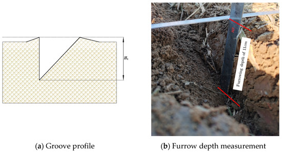 The test verified that the groove profile was opened by the furrow opener, as shown in Figure 11a (H1 is the depth of the furrow opening). The measurement of furrow depth is shown in Figure 11b. When measuring the depth of the furrow, the method of taking the average value of segment measurement in the literature [41] was adopted, five points were randomly chosen to measure the furrow depth in the operating interval with the presence of straw, and the average value was obtained. The test was repeated three times, and the stability coefficient of the furrow depth was obtained by calculating the average and standard deviation of the furrow depth.