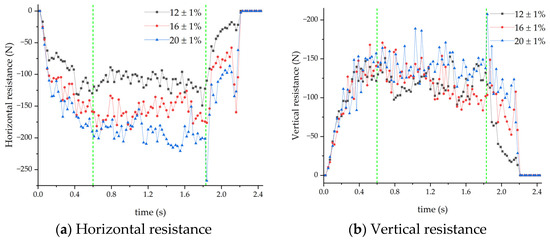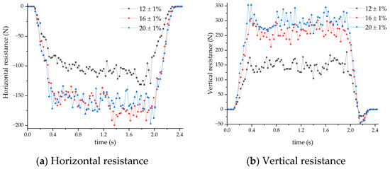 Figure 13a shows that the horizontal resistance to the support shovels is uniformly negative, showing that the force operates in the opposite direction to that of forward speed. When the soil moisture content is 12 ± 1%, the support shovel’s horizontal resistance ranges from −88.94 to −149.04 N, with 149.04 N as the maximum value; when the soil moisture content is 16 ± 1%, the horizontal resistance ranges from −126.08 to −186.25 N, with 186.25N as the maximum value; and when the soil moisture content is 20 ± 1%, the horizontal resistance ranges from −150 to −220.66 N, with 220.66 N as the maximum value. The horizontal resistance and fluctuation range increase as the soil moisture content rises. This is because the soil’s adhesion to the support shovel changes as the moisture content of the soil fluctuates. The soil’s adhesion to the support shovel also increases as the moisture content increases, and as the soil and the support shovel generate relative sliding, tangential friction along the direction of movement rises as well, increasing the horizontal resistance of the support shovel.