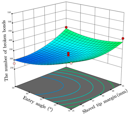 To further analyze the interaction effects of entry angle, entry gap angle, and shovel tip margin on the number of bond breaks Y, the response surfaces of the influencing factors on the test indexes were established, as shown in Figure 14. When the entry angle is between 25° and 39°, as shown in Figure 14, the number of broken bonds tends to go lower as the shovel tip margin goes up. This is because the entry angle is smaller, the soil is disturbed less, the contact time between the straw and the disc is short, and the straw can be quickly severed. The entry angle is between 39° and 55°, and the number of broken bonds with the increase in the shovel tip margin was first reduced and then increased. This change is because the entry angle is small, the shovel tip margin on the number of broken bonds is greater than the entry angle, and the number of broken bonds is a reduction trend. Increased entry angle causes the support shovel to disturb the soil more, but it has less of an impact on the number of broken bonds than increased shovel tip margin, which causes more soil to warp ahead of time and advances the point at which the straw first makes contact with the disc and the support shovel. As the opener moves forward, the straw slides along the support shovel, increasing the time of the cutting of the straw, and the cutting surface of the straw produces tearing, which increases the number of broken bonds.