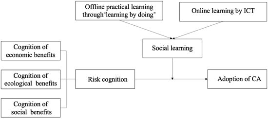 Online learning with information and communication technology (ICT) refers to a channel through which farmers acquire knowledge about CA by utilizing ICT tools. ICT is a powerful tool that facilitates communication, processes and transmits information electronically, and collects, stores, retrieves, and disseminates data and information using microelectronics, optics, telecommunications, and computers. It can bridge the communication gap between agricultural researchers, extension workers, farmers, and other stakeholders [29]. The adoption of CA is a risk-innovative behavior of a family, and there is a specific requirement for farmers to have online learning with ICT to gain information online to learn how to control the risk and allocate resources reasonably [30]. Learning relevant knowledge through ICT can help reduce the uncertainty of CA adoption. Firstly, more channels of social learning are needed in adopting CA, and farmers will gain lots of knowledge through online learning with ICT that can help them deal with the risks and uncertainties associated with CA adoption. The more frequent and proficient the use of ICT, the richer the content obtained, and the greater the likelihood of implementing the adoption of CA [25]. Secondly, the use of ICTs, such as mobile phones and computers, can make communication more effective, compensating for the drawbacks of incomplete information and low information quality in traditional offline learning channels. Furthermore, it increases opportunities for information sharing among family members and provides a foundation for family CA adoption in the future [31]. Thirdly, farmers’ risk cognition and online learning with ICT are mutually integrated. Online learning with ICT enhances farmers’ interactive needs and collaborative learning ability, enabling them to adapt to the dynamic changes of external risks in a timely manner and acquire and organize knowledge and information about CA quickly and comprehensively [32,33,34] to make the adoption of CA continuous and predictable. In conclusion, this study proposed that social learning, including offline practical learning through “learning by doing” and online learning with ICT, enhances the influence of farmers’ risk cognition on the adoption of CA. The mechanism is illustrated in Figure 1.