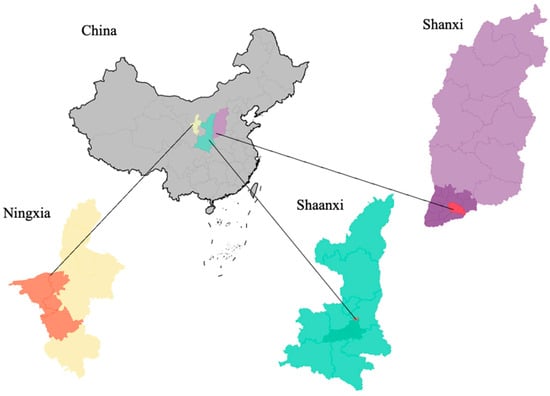 Initially, the representative survey method was used to select essential parts of the national ecological and environmental construction zone, including Shaanxi, Gansu, and Ningxia provinces (Figure 2). These provinces are located in the central and western parts of the Loess Plateau, characterized by a fragile natural environment, frequent and intense rainstorms, natural disasters, and vegetation destruction. Additionally, these regions are relatively densely populated, and social factors such as land misuse and over-exploitation have led to a significant decline in land quality. Therefore, data from these provinces hold high research value for studying CA. Then, the authors utilized stratified random sampling to select samples according to city, county (district), township, and village levels. First, they chose one city from each province and then chose 1–2 counties (districts) from the selected city. Specifically, the authors chose Yanliang District in Xi’an from Shaanxi Province, Yanhu District, Xia County in Yuncheng from Shanxi Province, and Zhongning County in Zhongwei from Ningxia. Then, 3–5 townships from each selected county (district) were randomly selected, and 5–8 villages from each township were chosen. Finally, 6–10 households from each village were randomly picked.
