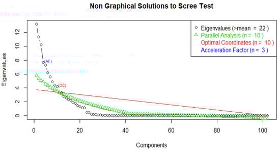 Using the results of the parallel analysis, we obtained ten factors that had equal or larger eigenvalues than those randomly simulated, which were retained (Figure 4). Results from the EFA (Exploratory Factor Analysis) are presented in the Supplementary Materials. The retained ten factors accounted for 71% of the total variance (eigenvalues ranging from 9.13 to 5.15). Of the 102 items, 74 (73%) were relevant contributors to the component’s variance (correlation > |0.5|).
