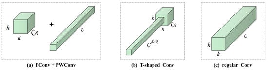 The initial implementation of the CSP module in YOLOv5 necessitated the use of multiple convolution operations, leading to a notable augmentation in the parameter number and computational complexity. The rationale behind conducting this study was derived from the FasterNet [62] model, which served as the impetus for suggesting the Faster-C3 module as a potential substitute for the CSP module. The PConv architecture represents an enhanced convolutional framework that facilitates the selective extraction of spatial features from a specific subset of input channels, while simultaneously preserving the remaining channels. This stands in contrast to conventional convolutional techniques. When dealing with situations that require sequential or conventional memory access, it is common practice to select either the first or last consecutive channel as a representative of the entire feature mapping. In this particular scenario, the computation solely considers inputs and outputs that possess an equal number of channels. In order to enhance the utilization of information from various channels, a pointwise state convolution (PWConv) is incorporated into PConv. A T-shaped convolution pattern is observed in the effective receptive domain of the input feature map, as depicted in Figure 3b. According to the illustration in Figure 3c, it is evident that this particular pattern places a higher degree of importance on the central position, in contrast to the traditional convolution method.