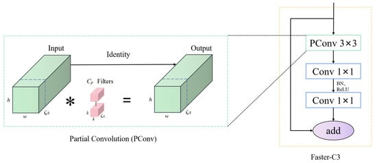 Each Faster-C3 model is equipped with a PConv layer, which is subsequently followed by two convolutional layers with a kernel size of . The combined entities are presented as inverted residual blocks, wherein the central layer possesses a greater number of channels and a shortcut connection is established to recycle the input features. A shortcut connection is implemented to facilitate the reuse of input features. The Faster-C3 module is depicted in Figure 4.