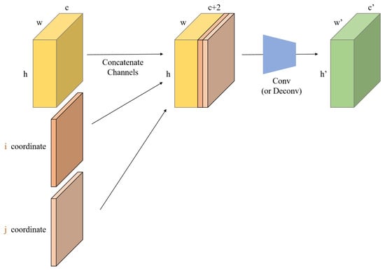 The variables , and c denote the height, width, and channel dimensions prior to the convolution process, while , and represent the resulting height, width, and channel dimensions after the convolution. The CoordConv technique initially establishes a connection between the supplementary channels and the incoming representation, in order to realize the mapping process. These channels consist of coordinates that are predetermined and cannot be changed. The simplest form of these channels includes one channel for the i-coordinate and another channel for the j-coordinate.