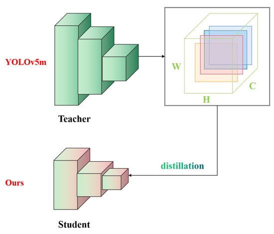 Knowledge distillation is an effective way to improve the detection accuracy of lightweight detection algorithms. Existing knowledge distillation methods typically use point-by-point alignment, or the alignment of structured information between spatial locations, but the channel contains a large amount of knowledge that is overlooked during the distillation process. Channel-wise knowledge distillation [65] allows better utilization of the knowledge in each channel, and the activation of the corresponding channel between the teacher and student networks should be adjusted in small steps. To do this, the activation of the channels is first transformed into a probability distribution, so that we can use probabilistic distance measures, such as KL scattering, to measure the differences. Denote the teacher and student networks as T and S, and the activation mappings for T and S as and , respectively. Channel-wise distillation losses can be expressed in a general form as